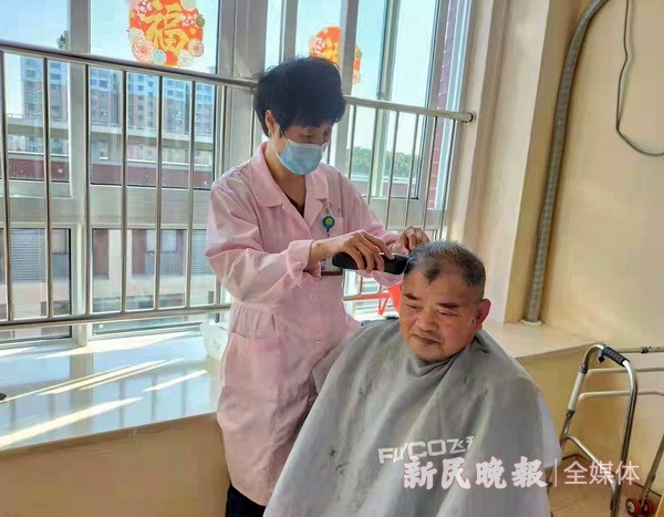 图为养老机构工作人员在为老人理发