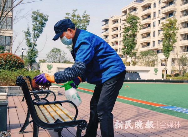 图为养老机构工作人员在为院内的椅子消毒