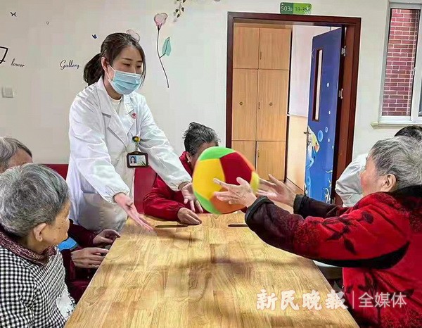 图为养老机构工作人员和老人在互动