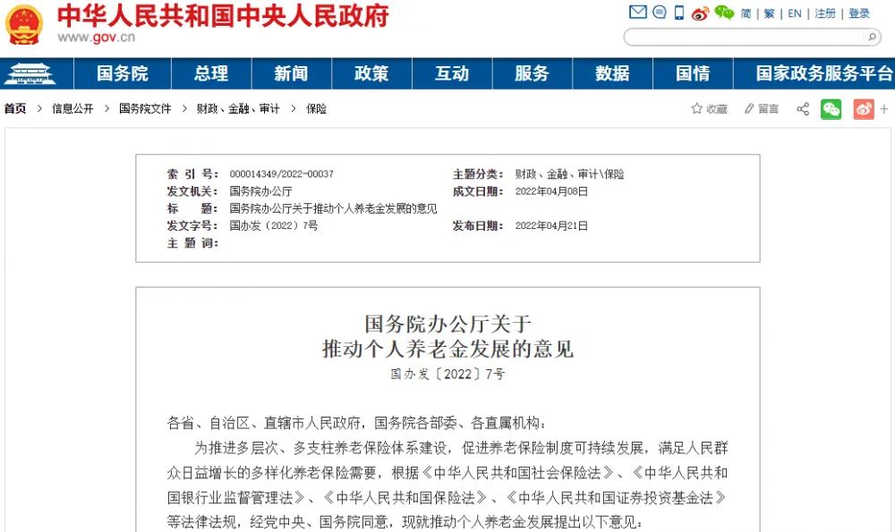 4月21日国务院办公厅发布《关于推动个人养老金发展的意见(国办发〔2022〕7号)》(简称意见)。明确了个人养老金的参加范围、制度模式、缴费水平、投资和领取等事项。