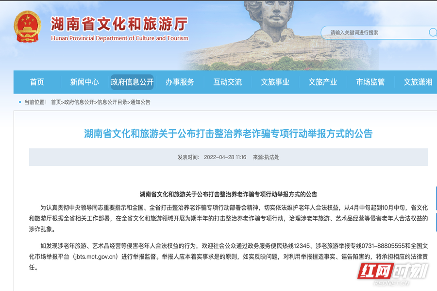 为认真贯彻全国、全省打击整治养老诈骗专项行动部署会精神,切实依法维护老年人合法权益,从4月中旬起到10月中旬,湖南省文化和旅游厅根据全省相关工作部署,在全省文化和旅游领域开展为期半年的打击整治养老诈骗专项行动,治理涉老年旅游、艺术品经营等侵害老年人合法权益的涉诈乱象。