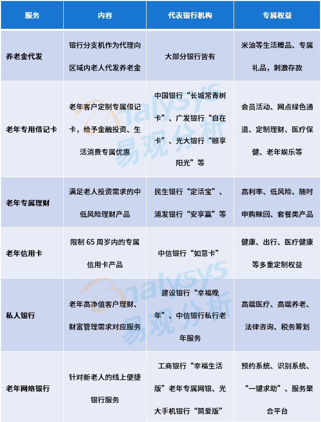 随着家庭收入与支出消费稳定,低龄老人的金融需求将会逐步提高,在此背景下,已有部分银行开始了针对养老金融服务的创新,以养老理财、借记卡产品为主。