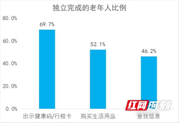 有统计数据显示:独立完成出示健康码/行程卡、购买生活用品和查找信息等网络活动的老年网民比例,已经分别达到69.7%、52.1%和46.2%。