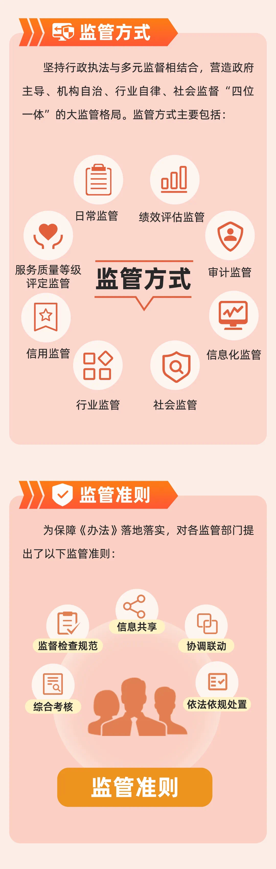《办法》从登记备案监管、服务监管、安全监管、从业人员监管、用地设施监管、资金监管、突发事件应对监管、服务主体退出监管、其他监管9个方面,实现对养老服务机构综合监管,牢牢守住质量和安全底线。