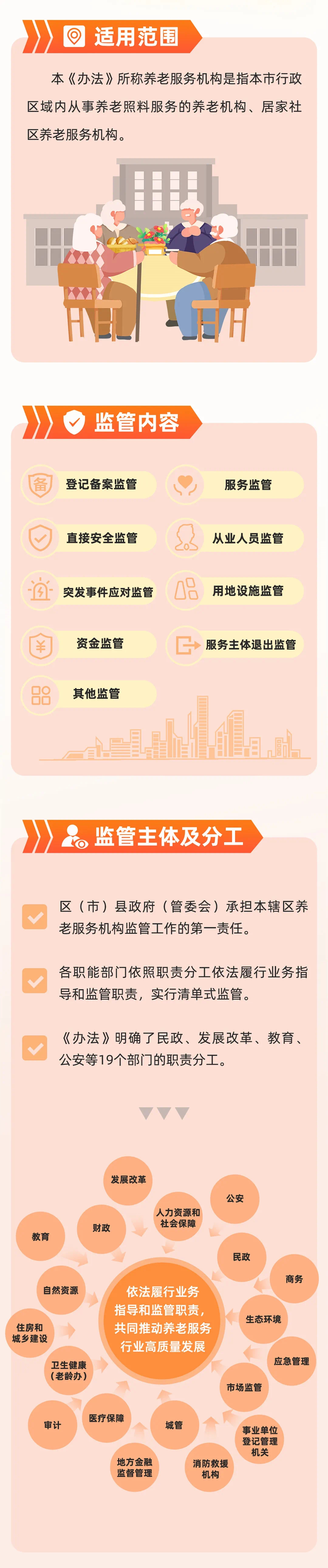 在监管主体及分工方面,《办法》明确,要强化政府主导责任,区(市)县政府(管委会)承担本行政区域养老服务机构监管工作的第一责任。其他各政府部门依照职责分工依法履行业务指导和监管职责,实行清单式监管。确认发展改革、民政、教育、公安等19个职能部门及单位职责分工,按照条块结合、以块为主的监管方针,强化区(市)县政府属地统筹管理责任,压实机构主体责任,加快推动形成权责明确、协同共治的综合监管体系。