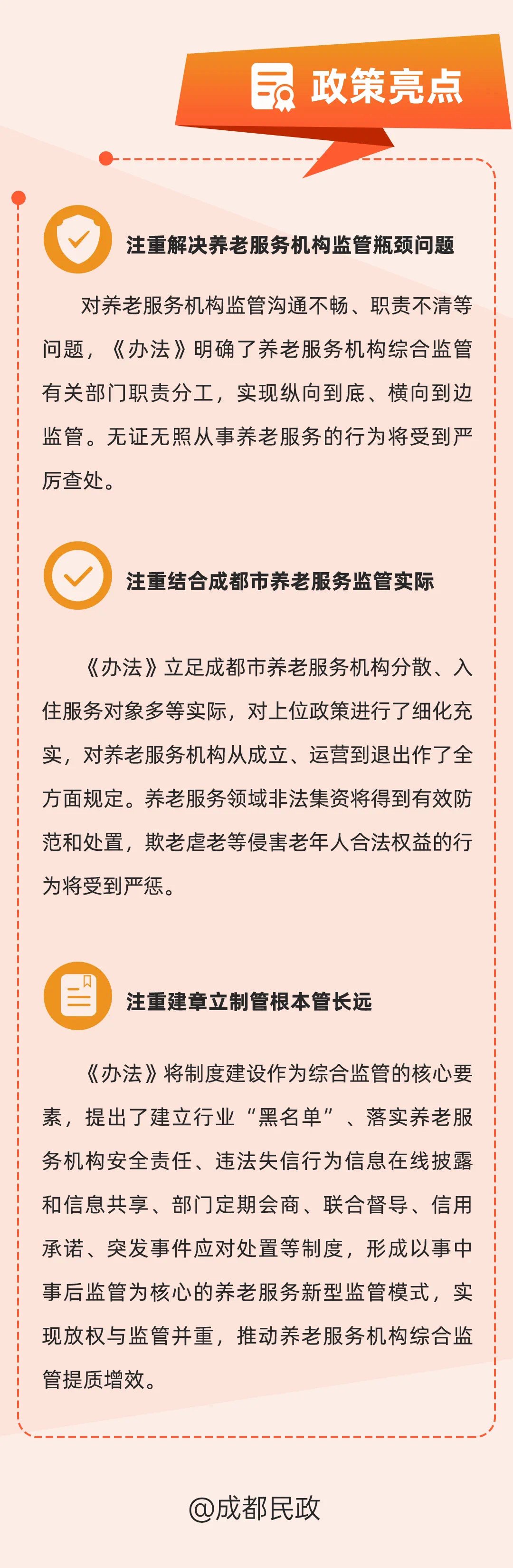成都市民政局相关负责人表示,该《办法》有三大特点。首先是注重解决养老服务机构监管瓶颈问题,对养老服务机构监管沟通不畅、协调不力、职责不清等问题,明确了养老服务机构综合监管有关部门职责分工,实现纵向到底、横向到边监管。其中,无证无照从事养老服务的行为将受到严厉查处。