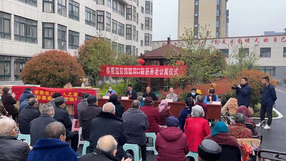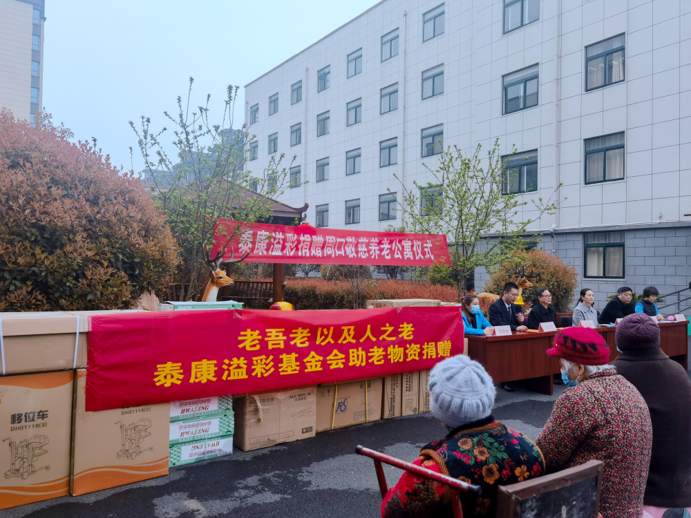 近年来,泰康持续关注并帮扶河南周口助老公益和乡村振兴项目。2003年11月,泰康人寿捐资20万兴建周口市太康县符草楼镇旺郑行政村泰康希望小学。2022年12月,泰康溢彩再次向该学校捐赠10万元教学设备。2021年7月,水灾期间,泰康溢彩向周口市红十字会捐赠40万,用于保障当地群众人身安全、采购紧急救灾物资、支持灾后重建工作。2023年3月,价值23.4万元的适老设备运抵周口敬慈养老公寓,将有效提升敬老院的养老服务水平,帮助更多老人享有健康幸福的晚年。
