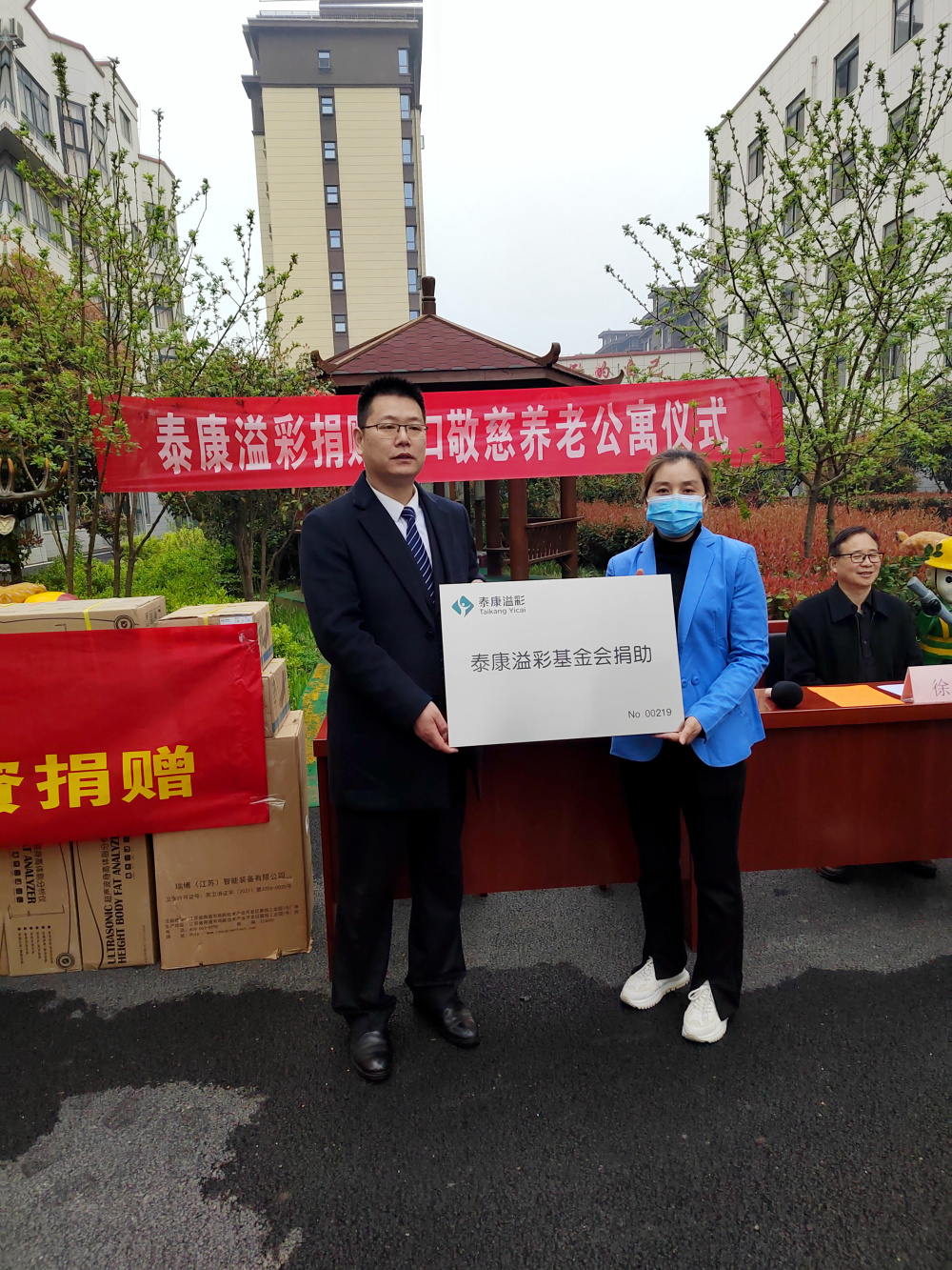 帮扶+赋能,推动养老行业发展。3月21日,泰康溢彩公益基金会“溢彩千家”项目捐助挂牌仪式在周口敬慈养老公寓举行,该敬老院正式悬挂“泰康溢彩基金会捐助”牌匾,并获赠总价值23.4万元的适老设备。