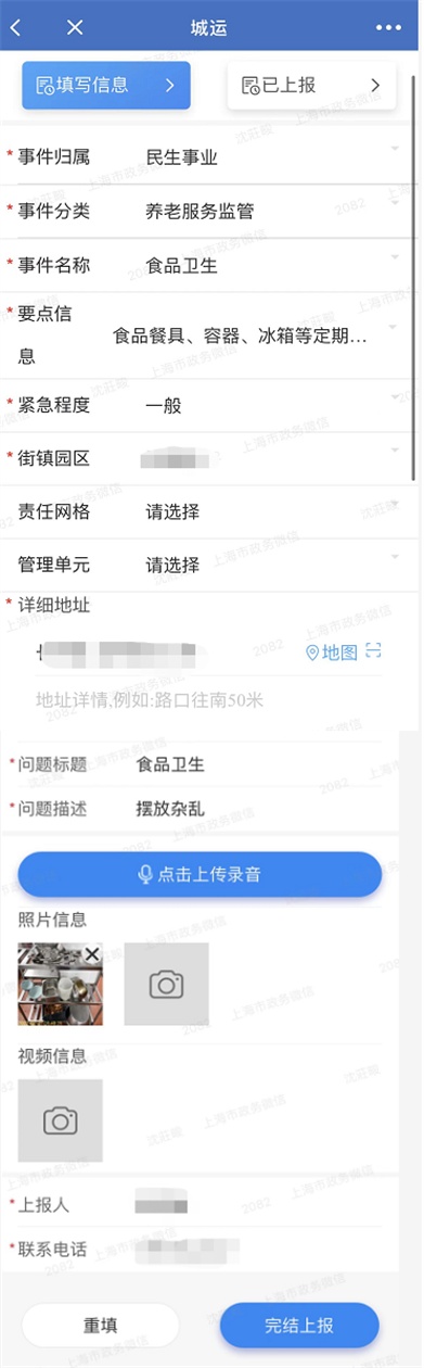 灭火器过期、常闭式消防安全门开启、厨房餐饮卫生存在隐患……在养老机构的日常自查和监管部门的巡查抽检中,工作人员一旦发现问题,只要当场拍照、录音取证,在政务微信中上报,案件工单就会实时传送至“一网统管”平台。派单人员将工单转至相关处置人员后,处置人员将收到提示,并在规定时间内处置完成,同时将处置结果拍照回传,在线即可核查,整个问题的处置也就形成了“闭环”。