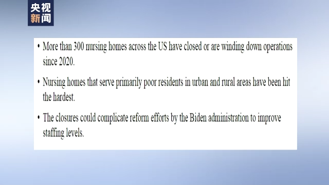 即便在疫情前,人手不足问题就一直困扰着养老院。本月6日发布的一份报告指出,数十年来美国养老机构的资金不足、对资金使用缺乏问责机制,养老机构员工收入低等问题,让此类机构一直是“非常不受欢迎的就业场所”,疫情则进一步加剧了养老院的劳动力短缺问题。专家警告称,由于美国养老体系的不完善、相关劳动力的持续短缺以及疫情的持续影响,可能还会造成更多养老院关门停业,尤其是在农村地区和主要为穷人服务的社区。