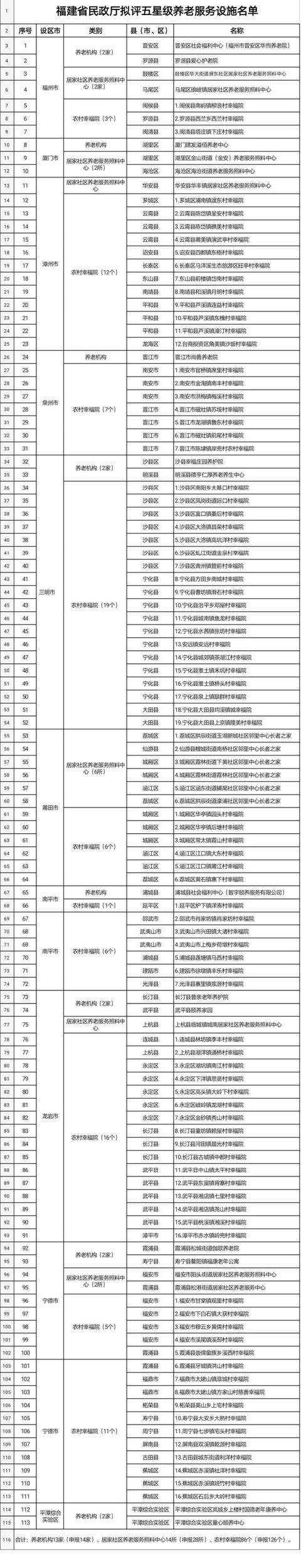 为发挥星级养老服务设施示范引领作用,促进养老服务高质量发展,根据我省养老服务设施等级评定办法和有关要求,按照机构申报、市(县)审查推荐等程序,省民政厅委托第三方评估机构,通过资料查验、实地考评,拟评定晋安区社会福利中心等13家养老机构为福建省五星级养老机构、鼓楼区华大街道屏东社区居家社区养老服务照料中心等14所为五星级居家社区养老服务照料中心、闽侯县南屿镇柳浪村农村幸福院等86个为五星级农村幸福院,现予公示(具体名单附后)。