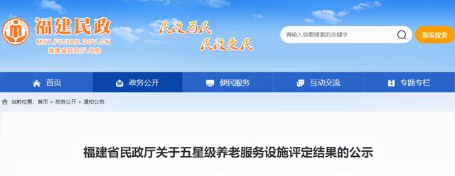 近日,福建省民政厅网站发布关于五星级养老服务设施评定结果的公示,详情如下——