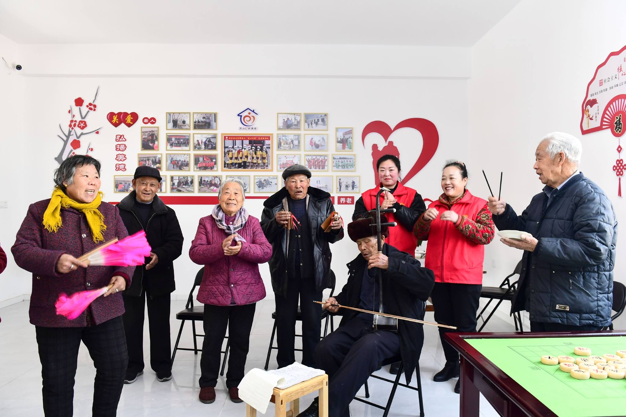 2月27日,在日照市岚山区虎山镇黄家峪村养老服务中心,老人们排练文娱节目。新华社记者 郭绪雷 摄