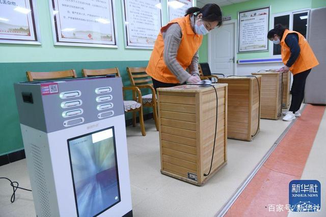 12月18日,在阜阳市颍州区文峰街道莲池社区日间照料中心智慧健康驿站内,工作人员对远红外生物频谱能量养生桶等设备进行保洁养护。新华社发(王彪 摄)