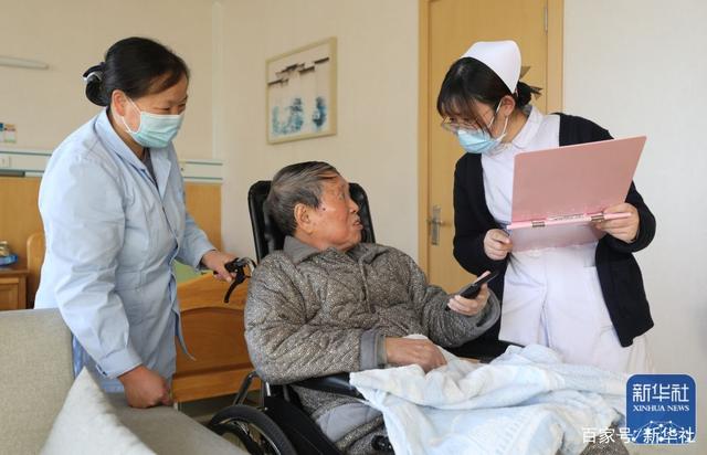 12月18日,在合肥市蜀山区清溪路社区一家护理院,护士(右一)在查房时询问老年人身体情况。新华社发(陈三虎 摄)