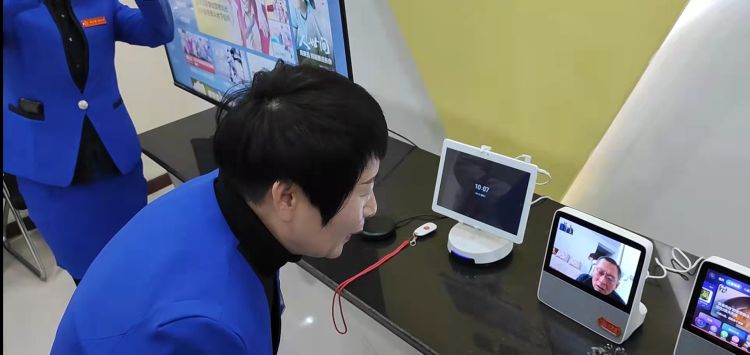在博山区华夏孝之源青龙山社区服务站,工作人员通过“孝百通”与家住城东街道峨嵋新村社区的姜大爷进行了视频通话。