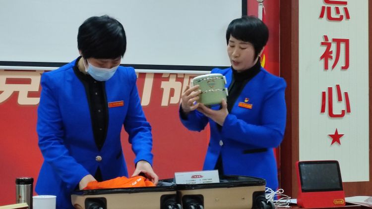 工作人员正在介绍为老人们上门服务的“必带套装”。
