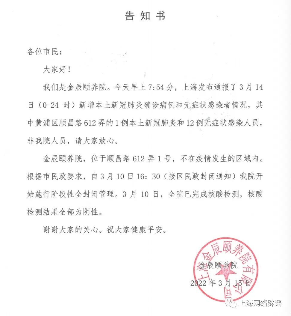 3月15日上午,金辰颐养院也发布了告知书,安抚在院老人及家属。