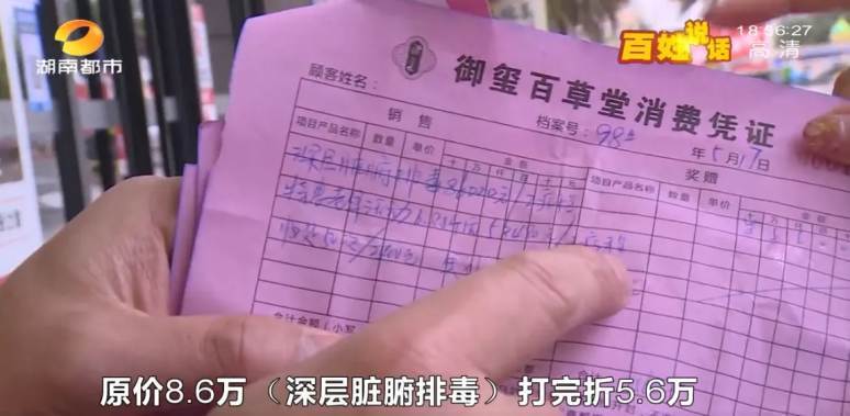 一叠由“御玺百草堂健康管理中心”开具的收据显示,刘先生母亲一年内消费了约11万元,其中“深层脏腑排毒”项目高达5.6万元。剩下的9万元,部分通过银行卡刷卡,另一部分现金交易。
