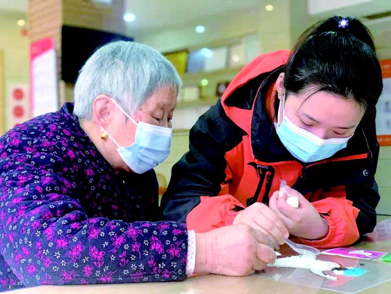 浏阳市银杏养护中心,工作人员指导老人DIY防疫图画。浏阳市银杏养护中心供图