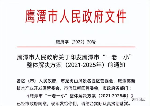 为推动全市养老托育服务健康发展,日前,鹰潭市人民政府印发《鹰潭市“一老一小”整体解决方案(2021-2025年)的通知》。下边,请随小编一起来看看《方案》的发展目标和将实施的48个“一老一小”领域重大项目具体有哪些——