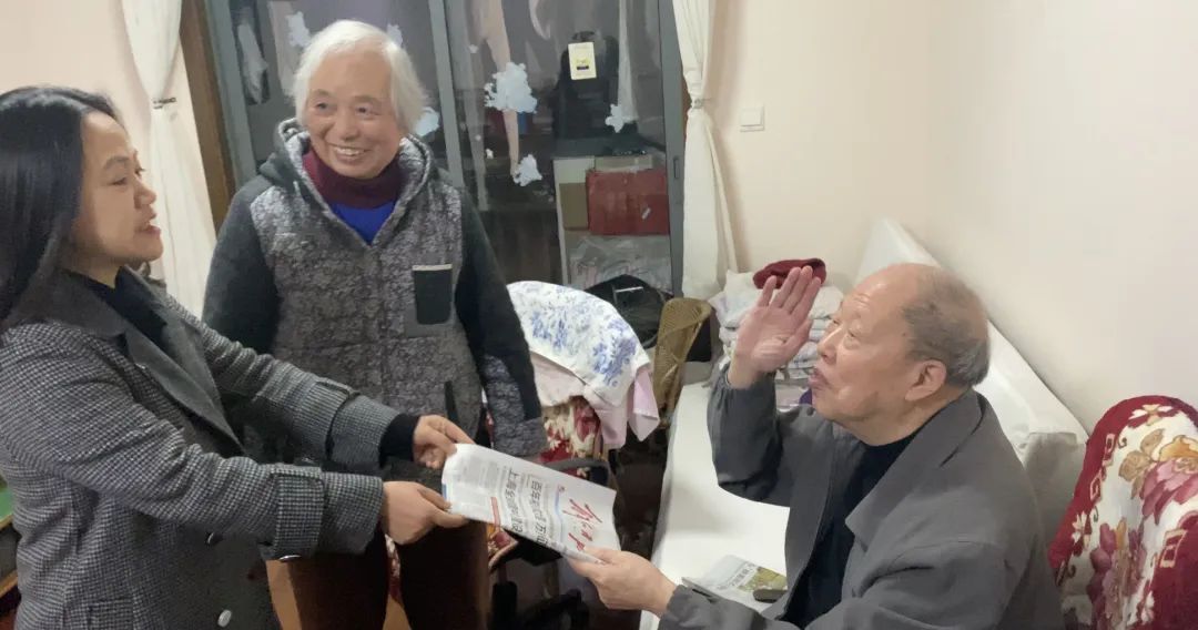 随后,居委会一行人又来到洪叔叔的家中,洪叔叔是退役军人,曾经历过战争,平时最大的爱好就是读书看报,他经常到小区的为老服务中心去翻看最新的报纸。居民庄婷在了解到这一消息后,主动将自家的订报年卡送给洪叔叔,并为他订了明年一年的报纸。
