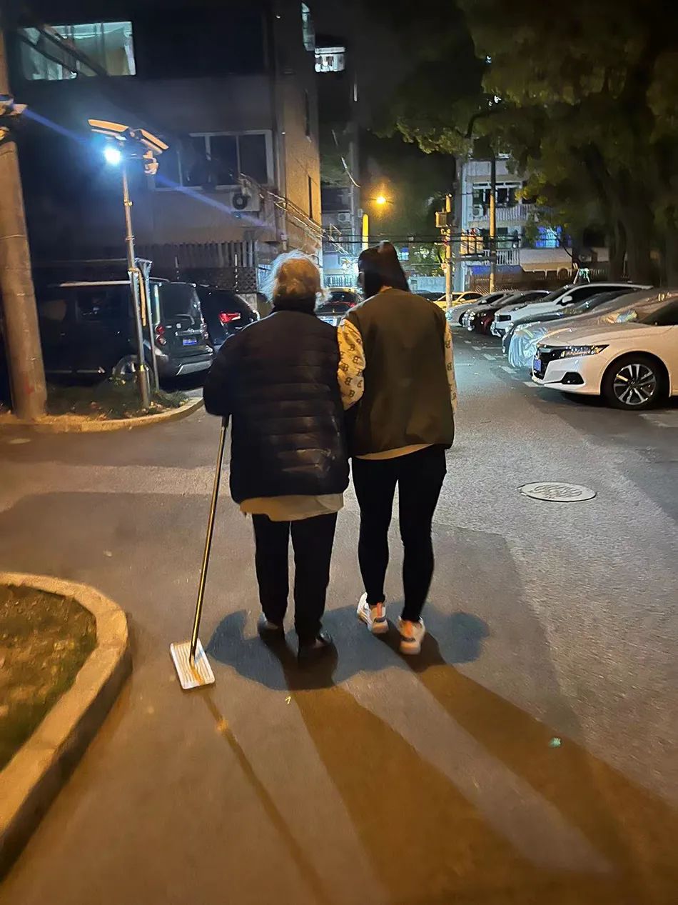 独居石化九村的老人王奶奶已86岁,有轻微的老年痴呆,因儿子居住在国外,被纳入“爱心点名”关爱对象。“我想出去逛逛。”一次夜里12点,她突然跑到小区门口要求出去,由于当时处于封控期间,石化九村居民区主任周玉书把她劝了回去,但许下了带老人“兜风”的约定。如今,小区列为防范区,周玉书如约扶着老人在小区里“溜达”,这一幕场景也被富利民记录下来。