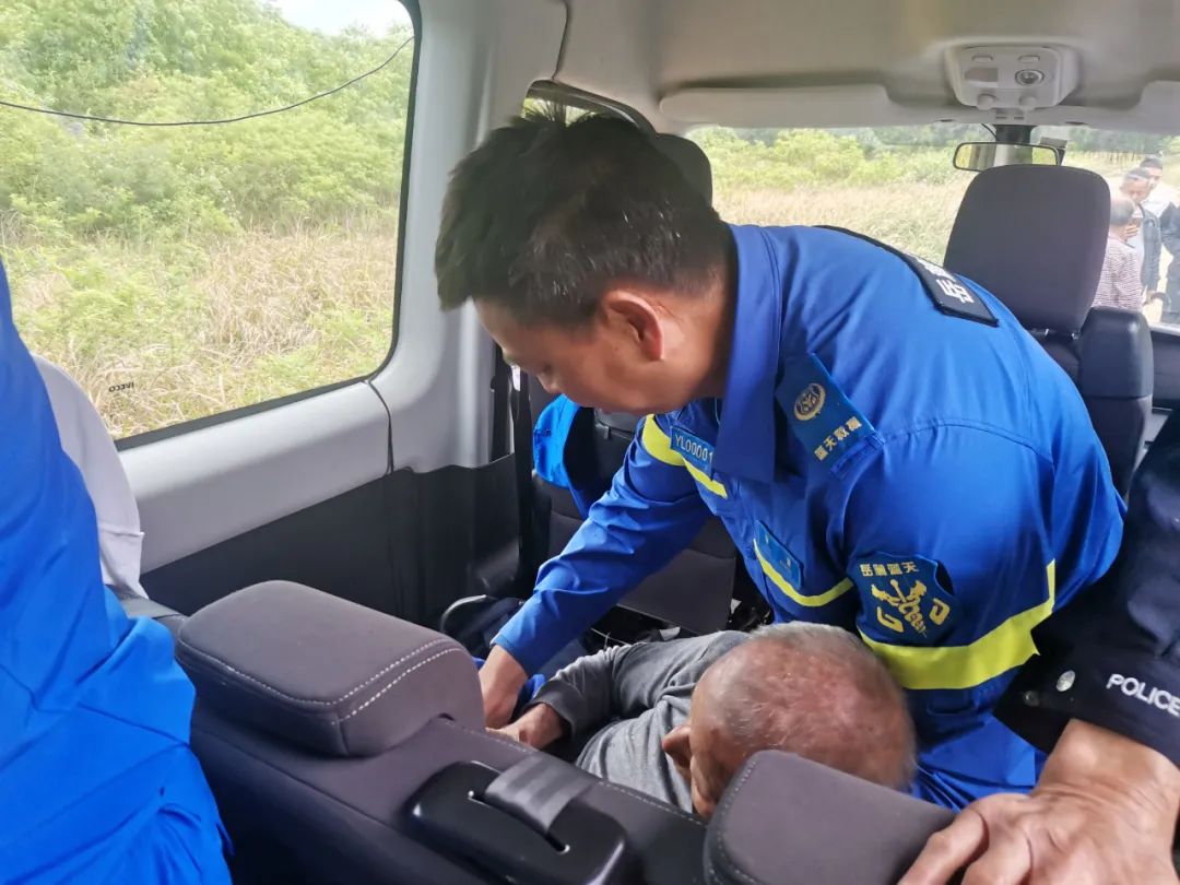 老人消失5天后,重新回到家人身边。而搜救了24小时的救援队队员们,为了避免老人转移救护车过程中受到二次碰撞,与谭章一起开车护送老人至新田县中医院,转交给医生。
