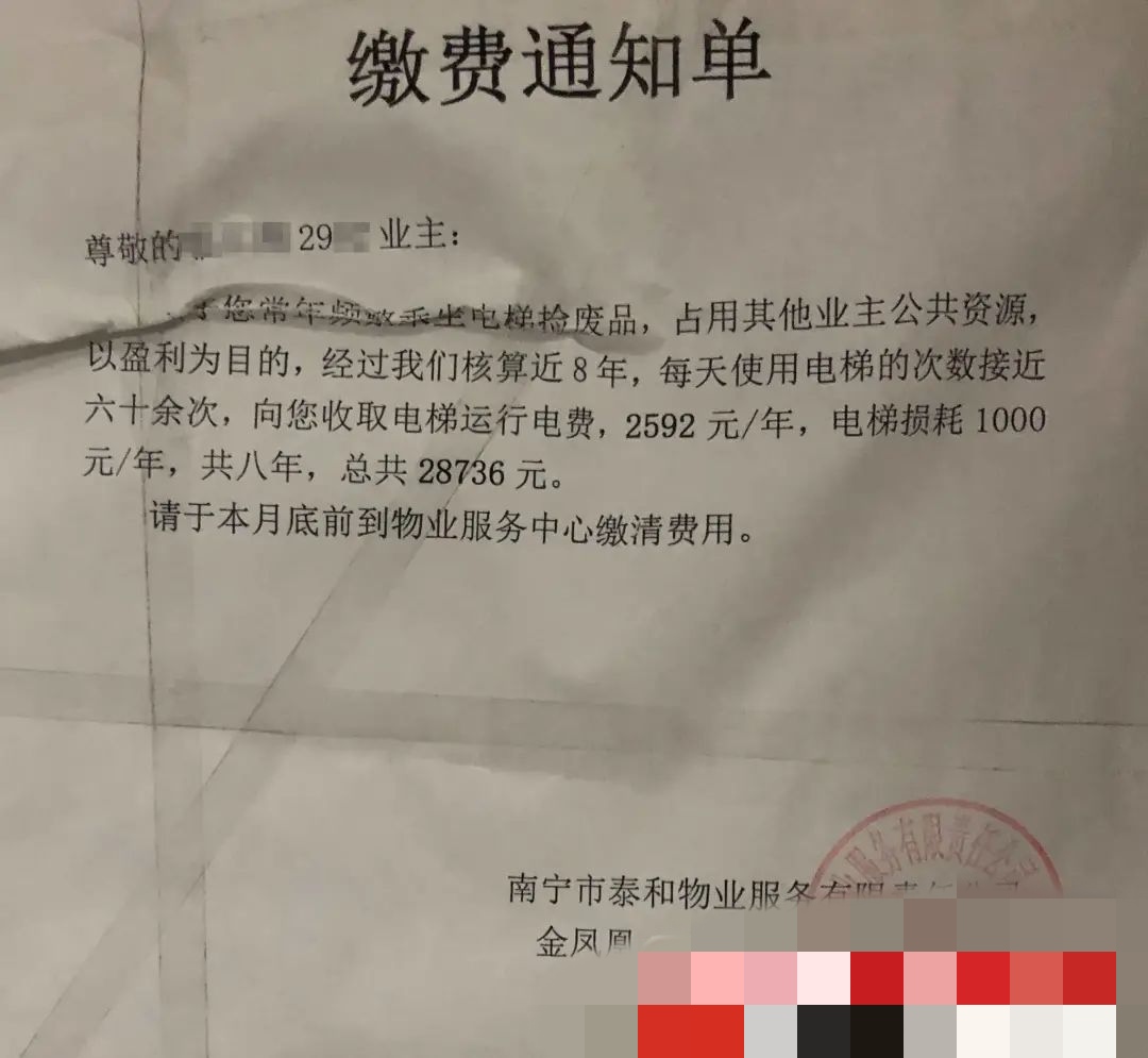 前些日子,南宁一小区物业,发布的催缴通知,在南宁人的微信群里传开了。这份催缴通知很特别,特别在催缴原因上:使用电梯频率过高,占用了其他业主的公共资源!