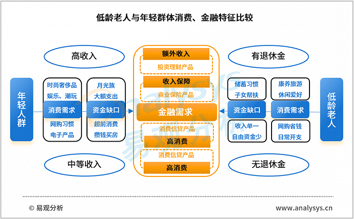与高龄老人不同,低龄老人在消费观念、数字应用、金融意识方面都更能紧随时代,人群特征主动追求“年轻态”的消费及生活体验;同时,低龄老人工作时代背景与高龄老人差异较大,大部分已经退休的低龄老人都积累了相当规模的固定资产、存款等财富,叠加退休金、养老金、兼职打工等持续性的收入,低龄老人不仅拥有较高的消费潜力,还拥有较大的金融服务拓展空间。