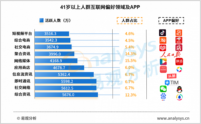 图 2-1 41岁及以上人群互联网偏好领域及APP