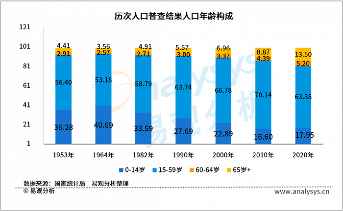 第七次人口普查结果显示,2020年,我国人口总数达141178万人,年均增长率为0.53%,全国人口规模处于较高水平且保持稳定的增势。其中,60岁及以上、65岁及以上的人口占比在历次人口普查中占比不断提升。