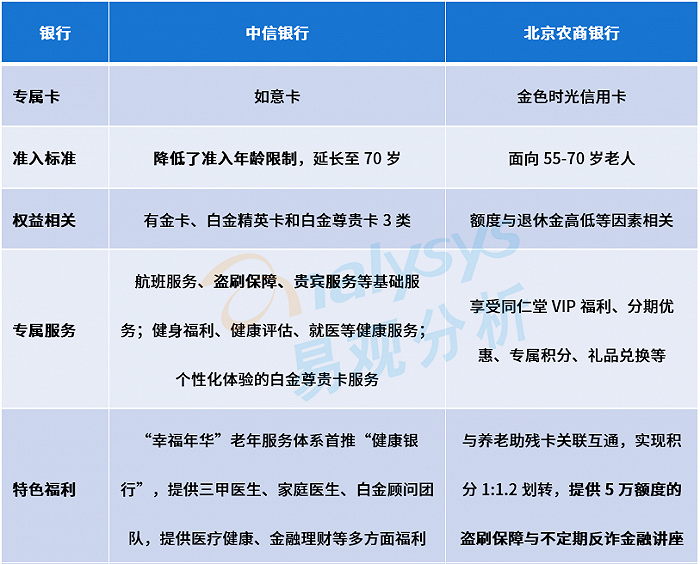 对此,部分银行已开始通过专属信用卡等方式发展老年人信用卡业务。例如,中信银行专属信用卡“如意卡”是国内首张年龄限制延长到70岁的专属信用卡,配置有“幸福年华”老年专属服务覆盖养老领域金融与非金融各个场景;北京农商银行面向55-70岁的“金色时光”专属信用卡与老年人退休金高低挂钩,与其他老年专属卡关联互通,解决了对老年人还款的顾虑。