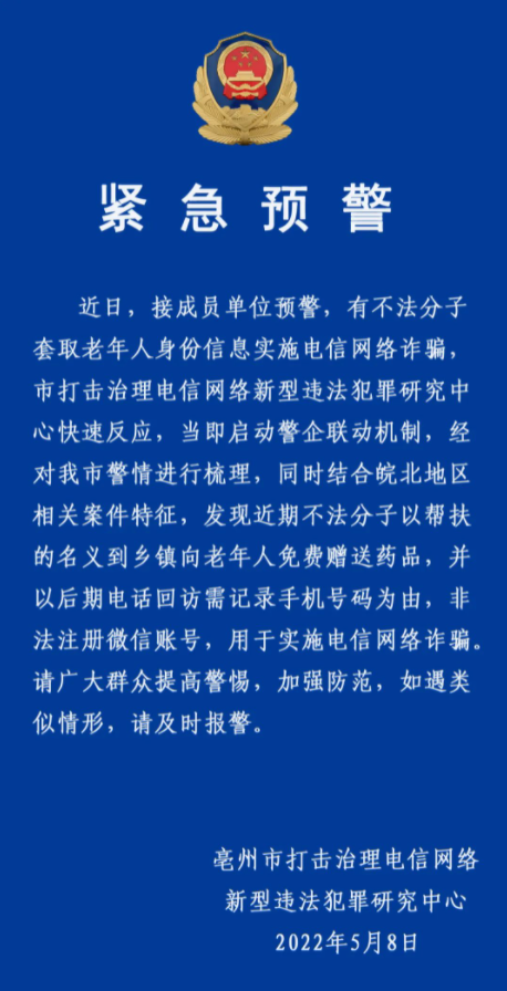 内容提要:5月10日,据“亳州发布”微信公众号消息,近日,亳州市打击治理电信网络新型违法犯罪研究中心发布紧急预警。