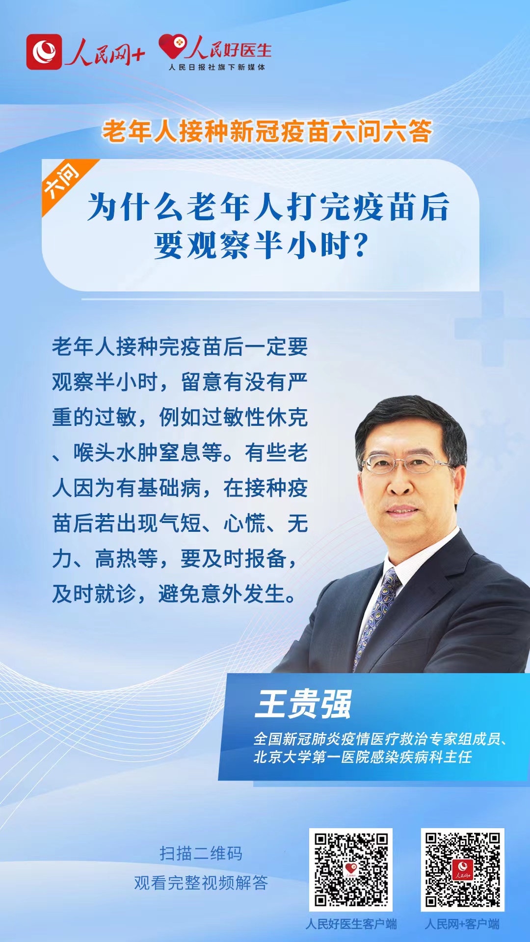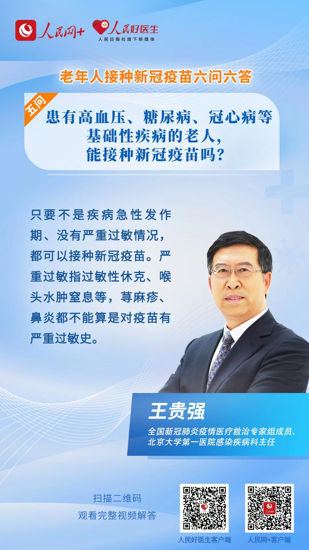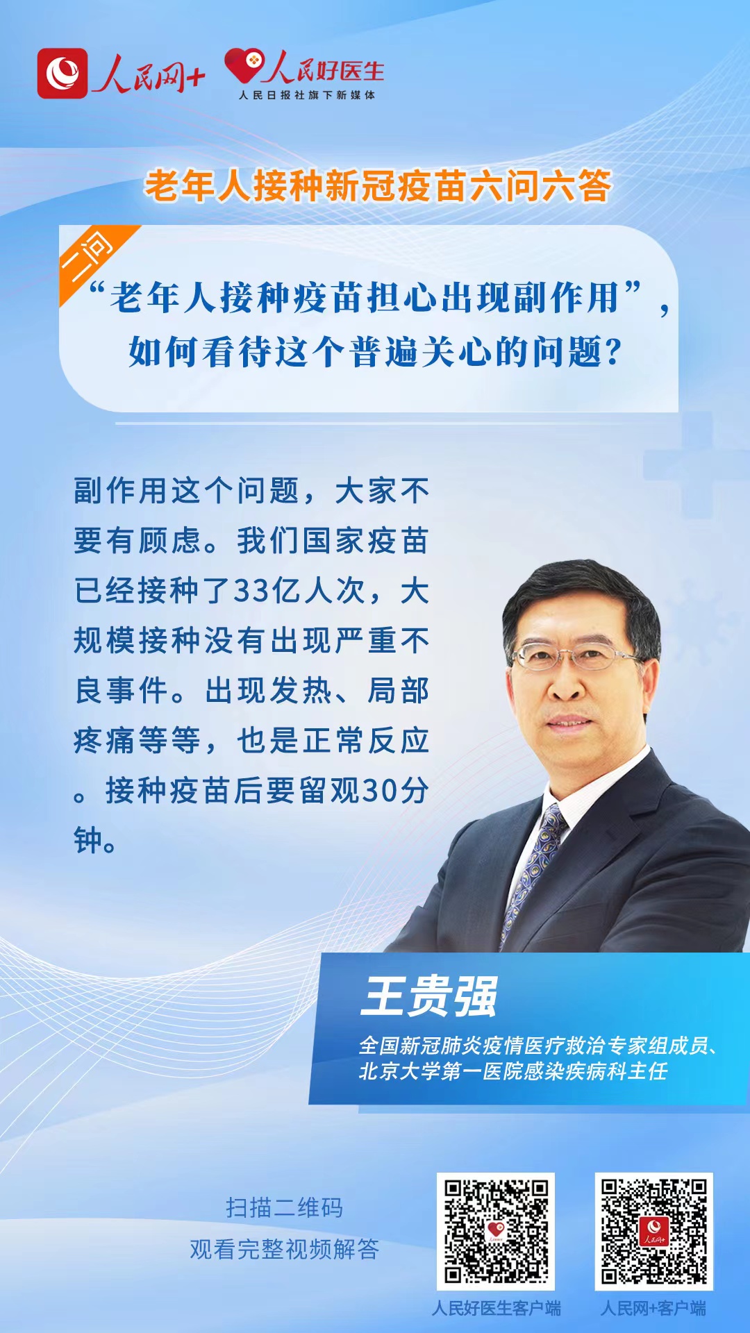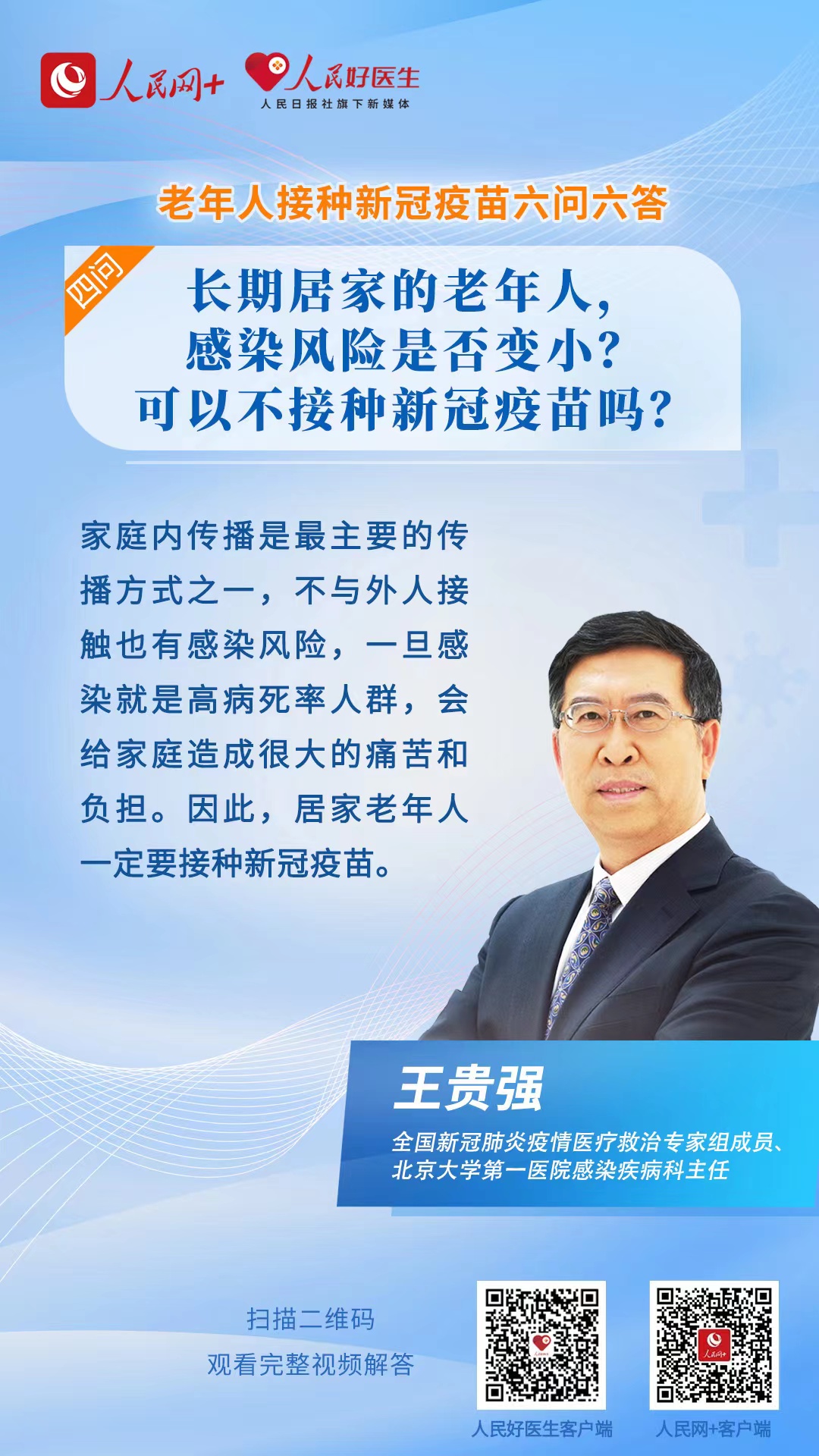 如何看待老年人接种新冠疫苗的必要性?老年人接种疫苗出现副作用怎么办?长期居家的老年人感染风险是否变小?患有高血压、糖尿病等基础性疾病的老人适合接种新冠疫苗吗?5月15日,人民网+客户端、人民好医生客户端邀请到全国新冠肺炎疫情医疗救治专家组成员、北京大学第一医院感染疾病科主任王贵强教授,对大众普遍关心的热点话题,进行一一解答。