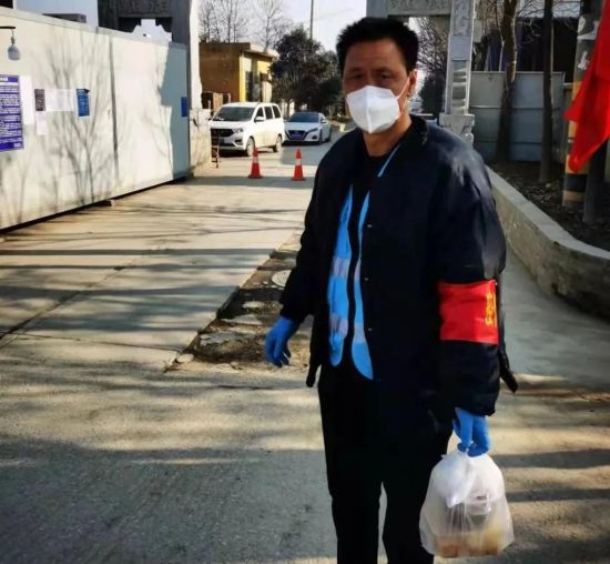 中午11点30分左右,韩震震准时把饭食送到村口执勤点,由村中民政信息员送至老人家中。