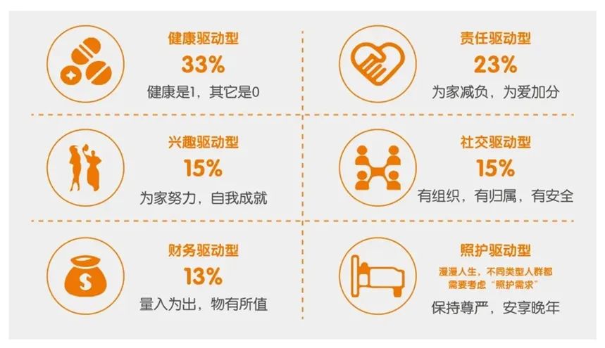 不仅如此,《享⽼指南》调研也发现:长辈对于养⽼的需求“千⼈千⾯” ,不⼀样的人群有着不⼀样的享⽼驱动因素。对此,《享⽼指南》立足国情,结合调研数据,特别定制了中国式银发族“退休规划评估模型”。该模型基于长辈的社交状态、独立能力、健康状况、兴趣爱好、经济能力、家庭责任等要素,总结归纳出了六大养老人群分型:健康驱动型、责任驱动型、兴趣驱动型、社交驱动型、财务驱动型、照护驱动型。其中,健康和责任两大驱动型人群占比达到了56%,成为追求品质养老的主流人群。