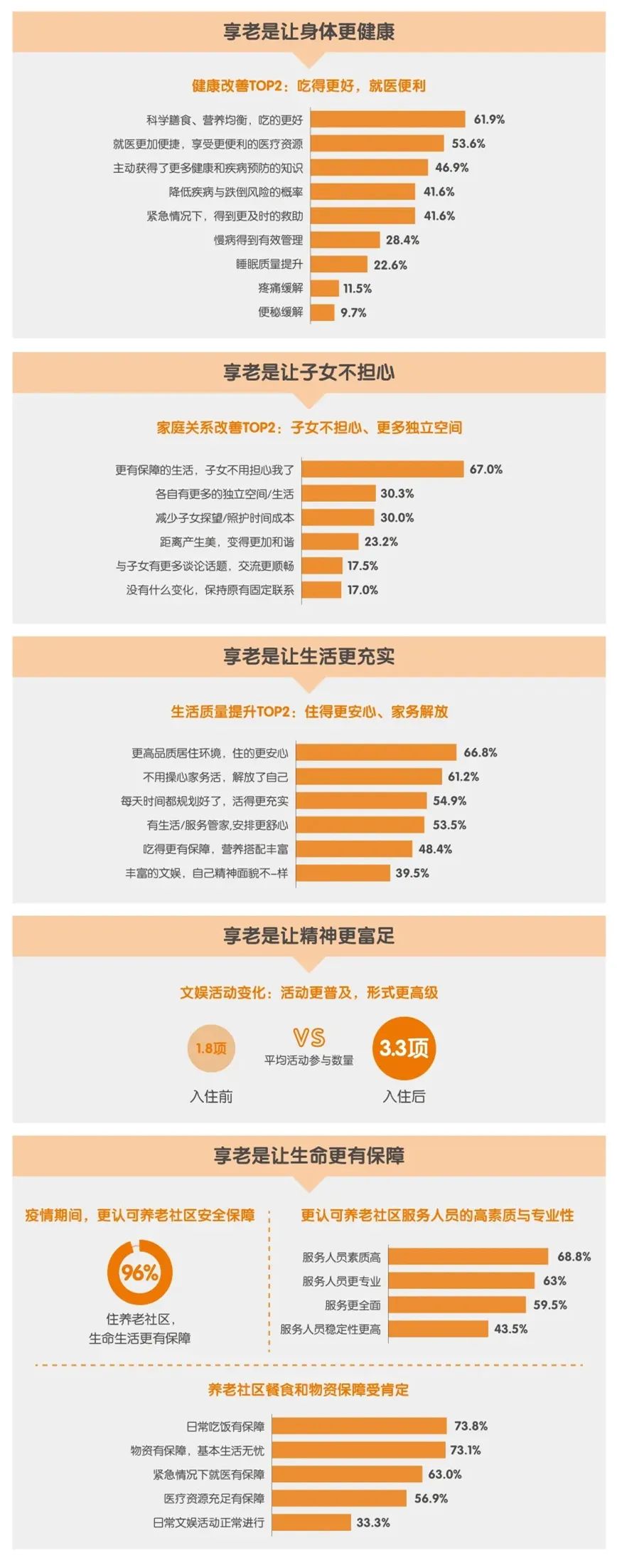 到底什么才是高品质的享老新生活?《享⽼指南》通过对泰康之家在住居⺠的生活状态调研发现,高品质的享老生活应该是这样的:身体更健康、子女不担心、生活更充实、精神更富足、生命有保障。