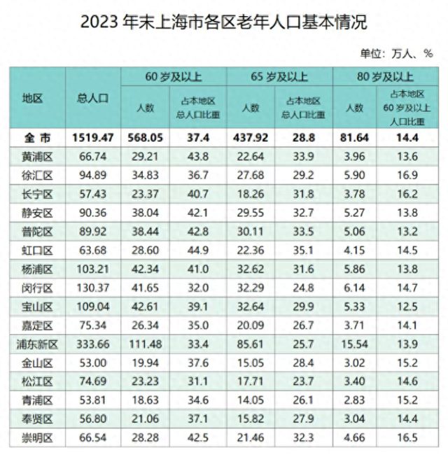上海市老龄工作委员会办公室、上海市民政局和上海市统计局最新公布2023年上海市户籍老年人口、老龄事业和养老服务有关综合统计信息。全市户籍人口1519.47万人。60岁及以上老年人口568.05万人,占总人口的37.4%。65岁及以上老年人口437.92万人,占总人口的28.8%。80岁及以上高龄老年人口81.64万人,占总人口的5.4%。虹口、黄浦和普陀,60岁及以上老年人口比重前三位