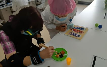 同样变“老”的还有该院老年医学中心主任杨红妮,她正在一旁完成用餐体验。“夹一颗红豆到杯子里”,听到指令,杨红妮在眼前盛放各类食物的盘子里寻找起了红豆。