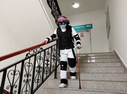 孙晓芳被要求完成在30米外的地方爬一次楼梯。走廊还是那个她每天行走多遍的地方,楼梯也还是那个台阶不算多、平时轻松就能上得去的楼梯。不一样的是,这次孙晓芳“老”了。