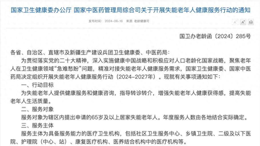 8月16日,国家卫生健康委、国家中医药局近日印发通知,决定组织开展失能老年人健康服务行动(2024-2027年),精准对接失能老年人健康服务需求。
