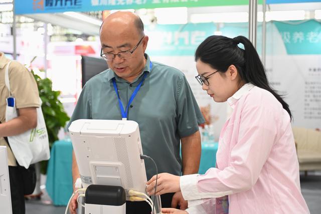 工作人员在宁夏2024养老服务业博览会上向参观者介绍医疗产品。新华社记者 毛竹 摄
