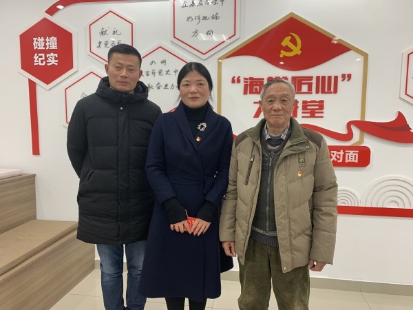 杨文权(左)、虎阜社区党委书记乔怡(中)和顾老伯(右)