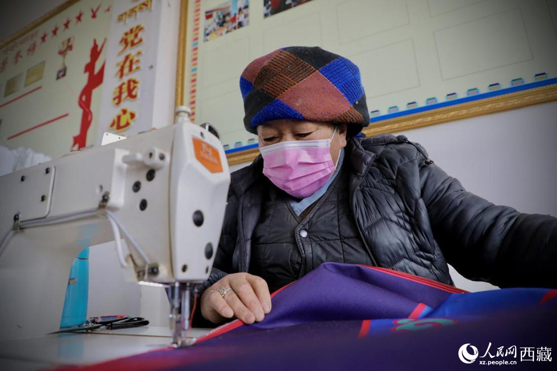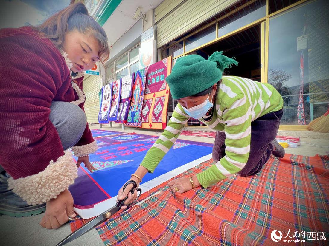农牧民专业合作社里的村民正在制作门帘。人民网 次仁罗布摄