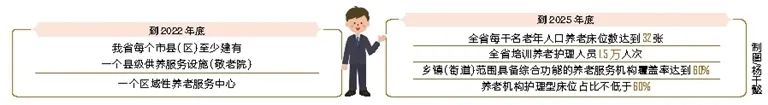 海南省民政厅相关负责人介绍,到2022年底,海南省每个市县(区)至少建有一个以失能、部分失能特困人员专业照护为主的县级供养服务设施(敬老院)、一个区域性养老服务中心。到2025年底,全省每千名老年人口养老床位数达到32张,全省培训养老护理人员1.5万人次,乡镇(街道)范围具备综合功能的养老服务机构覆盖率达到60%,养老机构护理型床位占比不低于60%。