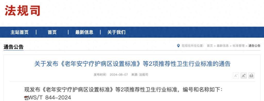 8月20日,国家卫生健康委发布《老年安宁疗护病区设置标准》《医养结合机构内老年人在养老区和医疗区之间床位转换标准》2项推荐性卫生行业标准,自2025年2月1日起施行。
