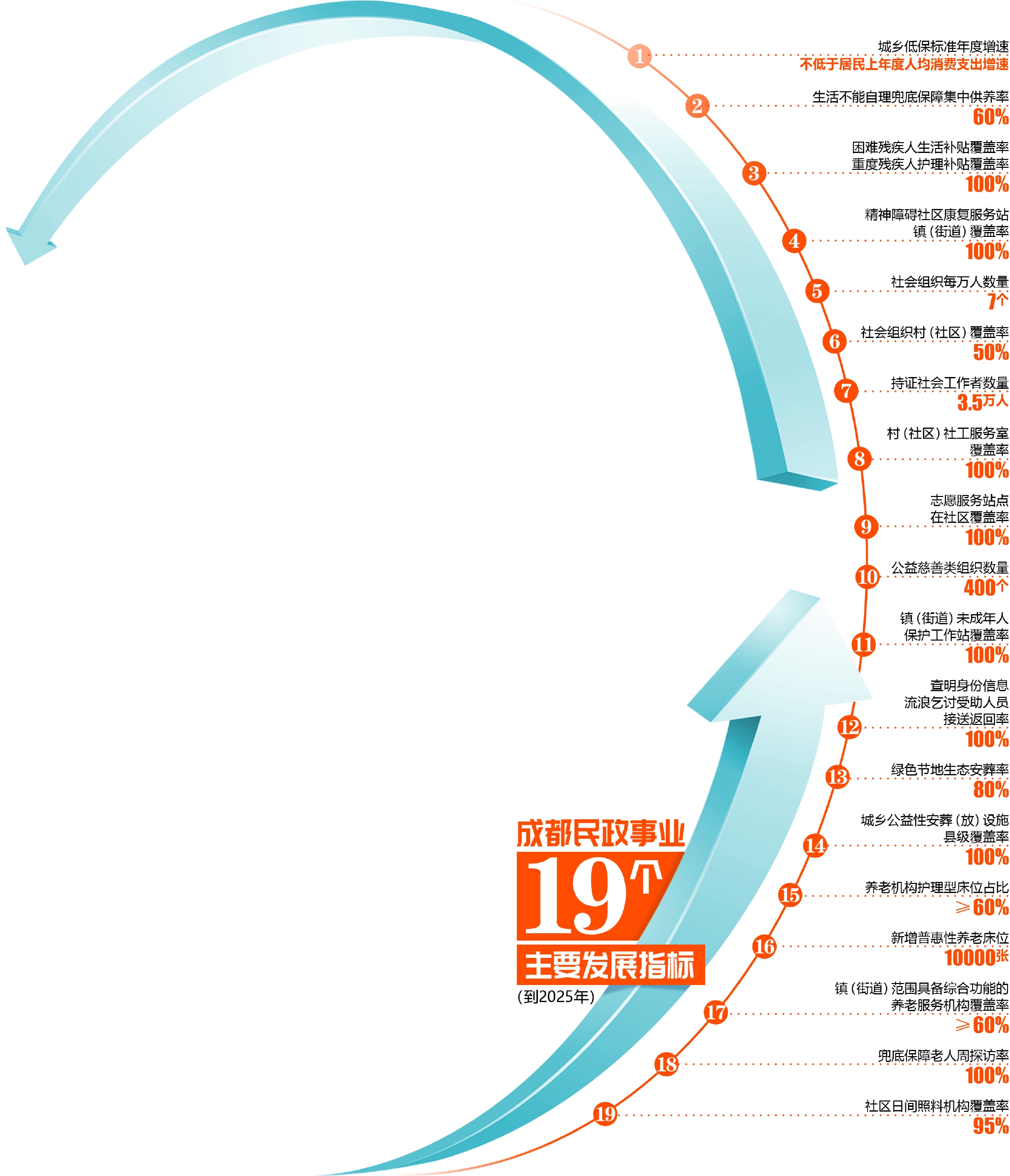 《规划》聚焦高质量发展主题和人民美好生活需要,以基本民生保障、基层治理、养老服务和专项社会服务四大体系建设为主线,以十项重点工程为支撑,设置了19个主要发展指标。这些指标精准落点到“社会救助、养老服务、基层社会治理”等能力提升工程上并明确了任务目标,譬如,到2025年,使生活不能自理兜底保障集中供养率由40%达到60%;公益慈善类组织增加至400个;精神障碍社区康复服务站镇(街道)覆盖率由10%达到100%等。
