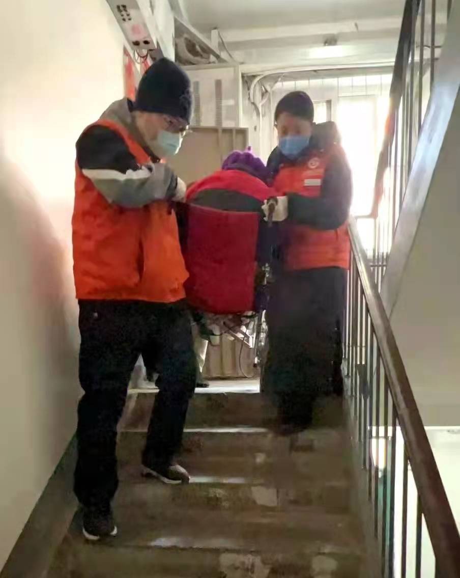 诚和敬养老驿站站长刘晓新每天都会给老人打电话,询问疫情期间老人的居家状态。有一天,当她在电话中得知有位失能老人经常睡觉,并且食欲不佳,出现面黄憔悴的情况时,她隐隐觉得情况不好。“老人居家期间,活动时间没有以前长了,身体状况很容易出现问题。”由于老人身边只有他的老伴,儿女不在身边,老伴想要送他就医却又无法将老人移动下楼,在征得家属的同意,并且执行防疫措施的前提下,刘晓新决定带着几位工作人员,协助老人就医检查。“经过检查,老人的脾胃和肝胆情况确实不是很好,目前已经在住院观察了。”