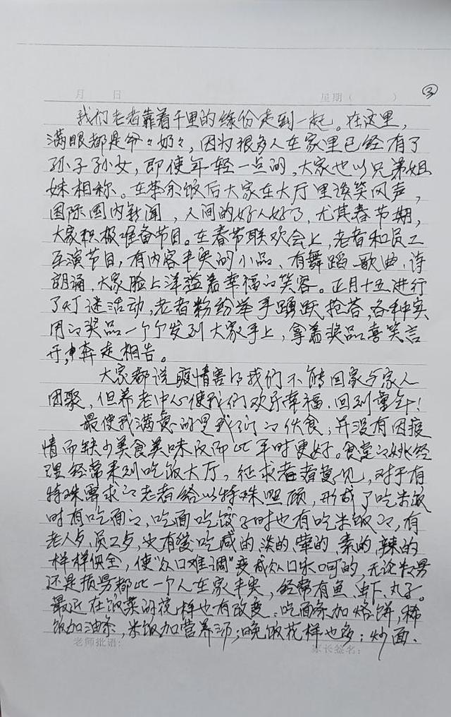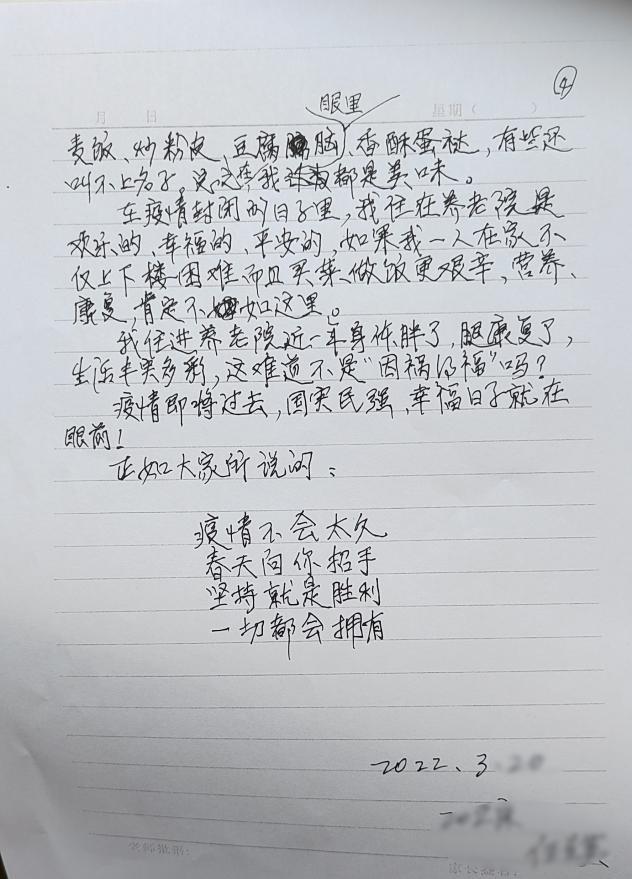 “大家都说疫情造成我们不能回家与家人团聚,可在养老中心我们感到欢乐幸福,仿佛回到童年。不仅如此,这里最使我满意的是我们的饮食。餐厅的经理会经常征求我们的意见,对有特殊需求的长者还会进行特殊的照顾。这里有员工餐、老人餐,经常有鱼、虾、丸子,咸的、淡的、荤的、素的、辣的样样俱全,使“众口难调”变成了“众口乐呵”,无论数量还是质量都比一个人在家丰盛。最近饭菜花样越来越多:面条配烙饼、米饭配营养汤、麦饭、炒粉皮、香酥蛋挞……还有些叫不上名字的,总之在我眼里都是美味。”